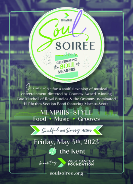 MEMPHIS, TENN., February 9, 2023 – West Cancer Foundation, whose mission is to advance the fight against cancer through research, education, patient support and community outreach, today announced it is hosting a new event to raise funds for cancer patient support and research programs. The inaugural Soul Soiree will celebrate the soul of the city with Memphis-style food and music on May 5 at the Kent, a new special event venue in the historic Snuff District near downtown. Entertainment will be led by Grammy Award-winning Boo Mitchell of Royal Studios and the Grammy-nominated Hi Rhythm Section Band featuring Marcus Scott.